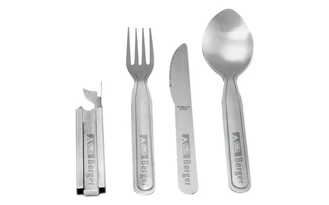 Bestaand uit mes, vork, lepel, inklapbaar, in etui.