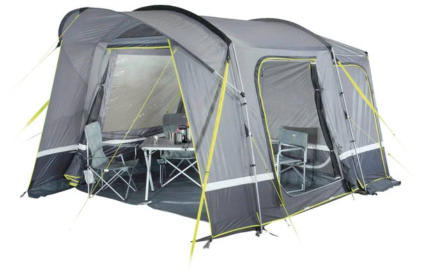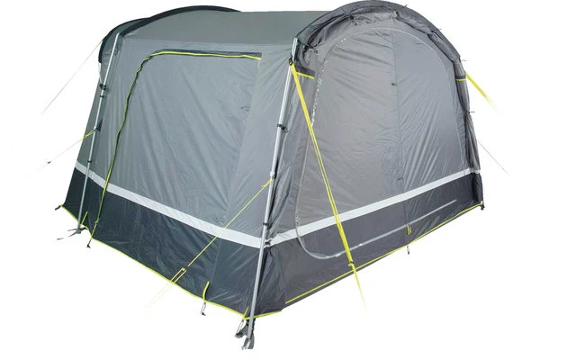 Een hoge ventilatie ventileert de tent op regenachtige dagen. Afsluitbare, 50/50 deelbare achterwand. De hele achterwand past in de Easy Stow Away-tas, zodat u hem niet hoeft op te rollen. Extra heavy duty ritsen met regenhoes om vocht te voorkomen. 4 neon gele verstelbare stormbanden en scheerlijnen zijn goed zichtbaar in de schemering. Kabelinvoer via rits en kabelgeleiding voor verlichting. Sluis: De sluis heeft een dakbevestigingslengte van 250 cm en een verstelbare bevestigingshoogte van 180-240 cm door middel van een ritssluiting en verstelbare singels. 2 luchtsluisdeuren geven toegang tot het voertuig.