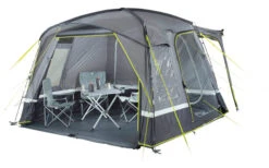 De dakconstructie en de zijwanden bieden een optimaal gevoel van ruimte. De stevig aan de buitentent vastgenaaide vloer voorkomt het binnendringen van vuil, vocht en kruipende dieren en beschermt tegen tocht. De vloerkuip kan bij de ingang worden neergeklapt en voorkomt struikelgevaar. De ingang kan worden geopend als luifel met behulp van de meegeleverde stokken. 2 gaasramen van extra sterk, scheurvast 150D “Superfine” muskietengaas ventileren het leefgedeelte en houden insecten buiten de tent. De binnenflappen met ritssluiting kunnen gemakkelijk en variabel worden bediend, afhankelijk van de weersomstandigheden. 2 doorzichtige folieramen met binnenritsbare raamflappen kunnen gemakkelijk en variabel worden bediend. 2 permanente ventilatieopeningen ventileren de tent op regenachtige dagen. Afsluitbare, 50/50 deelbare achterwand. De hele achterwand past in de Easy Stow Away-tas, zodat u hem niet hoeft op te rollen. Extra heavy duty ritsen met regenhoes om vocht te voorkomen. 4 neon gele verstelbare stormbanden en scheerlijnen zijn goed zichtbaar in de schemering. Kabelinvoer via rits en kabelgeleiding voor verlichting.