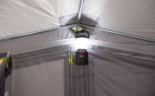 4 neon gele verstelbare stormbanden en scheerlijnen zijn goed zichtbaar in de schemering. De sluis heeft een dakbevestigingslengte van 245 cm en een verstelbare bevestigingshoogte van 180-240 cm door middel van ritssluitingen en verstelbare singels. 2 luchtsluisdeuren geven toegang tot het voertuig. Het praktische “Drive Away Zip System” maakt het aan- en afkoppelen van voertuigen gemakkelijk. De tent is uitgerust met een kederritsrail. Trek de keder in de kederrail op het voertuig en maak hem vast met een rits. Het slot kan volledig worden opgerold. Flexibele bevestiging aan het voertuig. 1- Holle zoom sluit paal met klemmen of scheerlijnen.