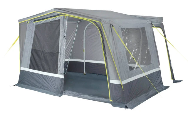 De steile wandtent met stalen buisstokken heeft een zeer hoge stabiliteit en optimale benutting van de ruimte. Afneembaar grondzeil en PVC septic strips houden vuil en vocht uit de tent. De badkuipvloer wordt eenvoudig aan de buitentent vastgehaakt en kan worden verwijderd voor een gemakkelijke reiniging. De voorkant van de veranda kan helemaal tot het midden worden geopend of helemaal, afhankelijk van het weer.